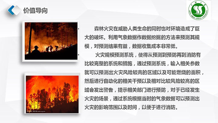 火災(zāi)規(guī)模預(yù)測系統(tǒng)使得從預(yù)測到預(yù)防再到消防有比較完整的系統(tǒng)和措施,通過預(yù)測系統(tǒng),輸入相關(guān)參數(shù)就可以預(yù)測出火災(zāi)風(fēng)險較高的區(qū)域以及可能燃燒的面積,然后進行自動化的相關(guān)干預(yù)以及相對比較風(fēng)險較高的區(qū)域會發(fā)出警告,提示相關(guān)部門進行預(yù)防,對于已經(jīng)發(fā)生火災(zāi)的場景,通過系統(tǒng)根據(jù)當(dāng)時的氣象數(shù)據(jù)可以預(yù)測出火災(zāi)的影響范圍以及時間,以便于進行消防。